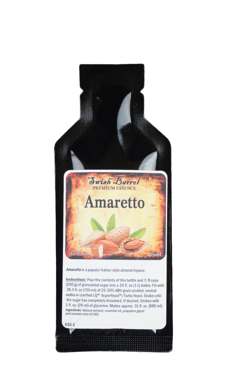 Amaretto Essence 20ml made by Swish Barrel Company, is a easy way to mix with any (750ml) of 25% to 30% ABV grain alcohol, neutral vodka. Just pour in contents of the essence bottle, and 7/8 cups of sugar into bottle. Shake well until the sugar has completely dissolved, if desired thicken with 1oz of glycerine.