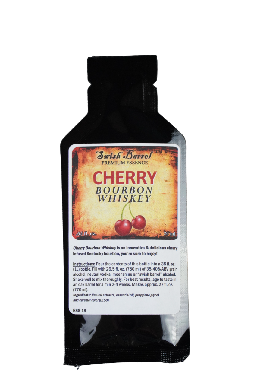 Cherry Bourbon Whiskey Essence 20ml made by Swish Barrel Company, is a easy way to mix with any (750ml) of 25% to 30% ABV grain alcohol, neutral vodka. Just pour in contents of the essence bottle and shake thoroughly. For best results age in a barrel to taste for a min of 2-4 weeks.