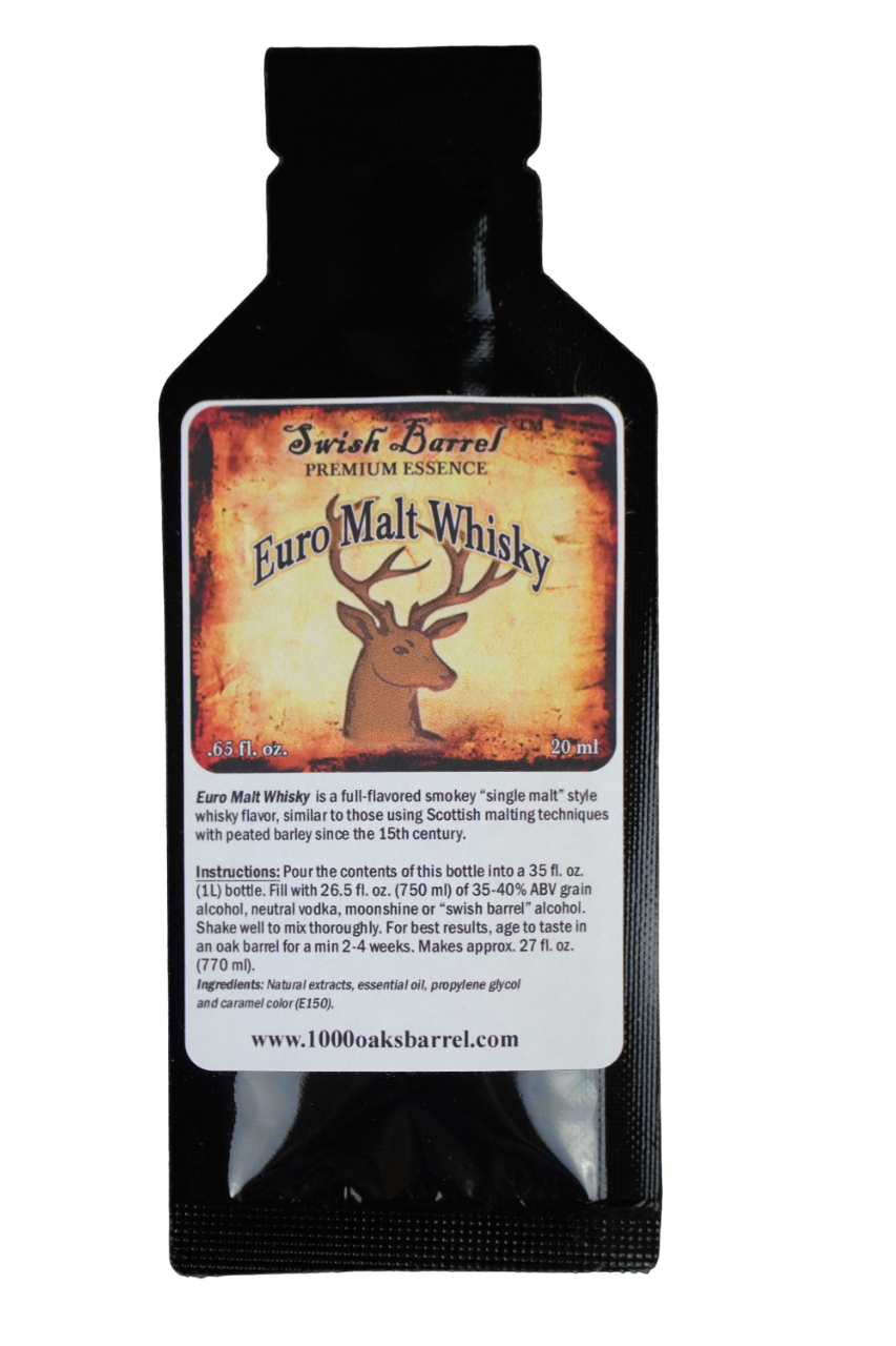 Euro Malt Whiskey Essence 20ml made by Swish Barrel Company, is a easy way to mix with any (750ml) of 25% to 30% ABV grain alcohol, neutral vodka. Just pour in contents of the essence bottle and shake thoroughly. For best results age in a barrel to taste for a min of 2-4 weeks.