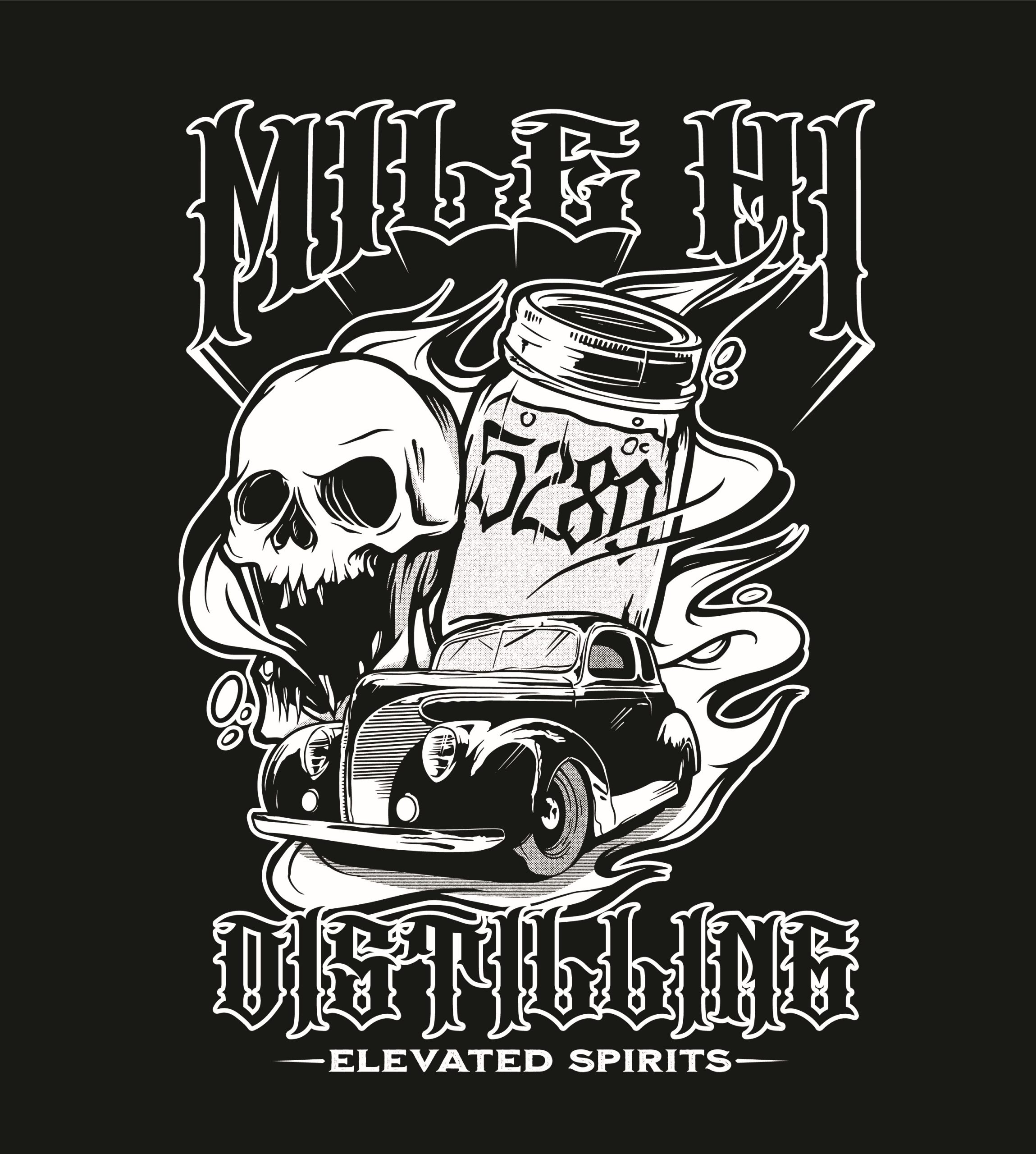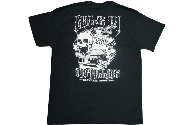 Mile Hi Distilling T-shirt available in SM,MED,LG,XL,XXL and XXXL sizes. Black color with a plain black front design and hand-drawn back design. Get yours today!