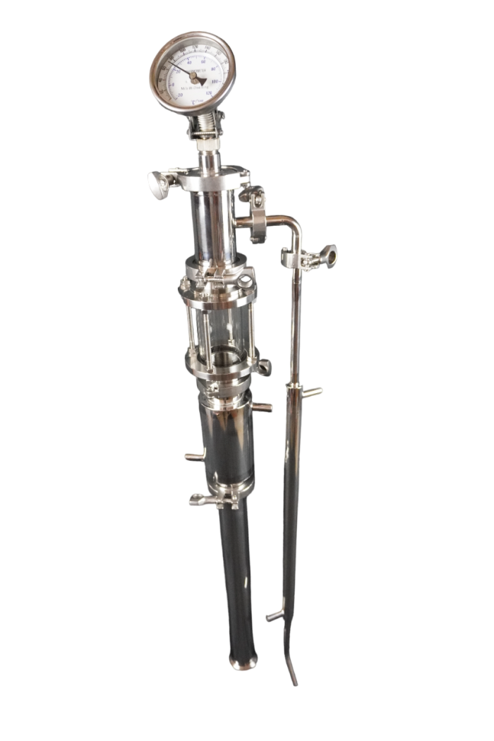 For reflux it is as easy as running water to both reflux condenser and final product condenser. For pot still mode, it’s as simply as un-clamping the reflux condenser and removing it from the column in this extremely versatile and user-friendly design. Pack the column with rings and copper mesh and your running a reflux alcohol still or run as a pot still by running water to just the final product condenser on the arm and inserting one roll of copper in the tower.