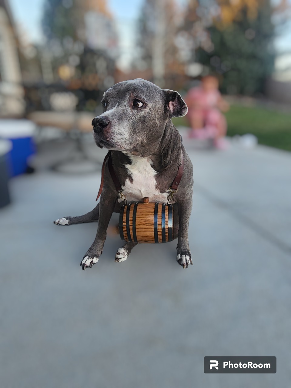 1/4 Gallon Saint Bernard Dog Barrel is a great barrel size for a bar top decoration or sling the included collar around your doggy for a portable whiskey tap. With the amount of surface area in these barrels, aging for 2-3 months is perfect! Put the barrel on your dog once full and have a portable keg tap! Recommended for larger breeds of dogs. Picture of American Staffordshire Terrier for scale.