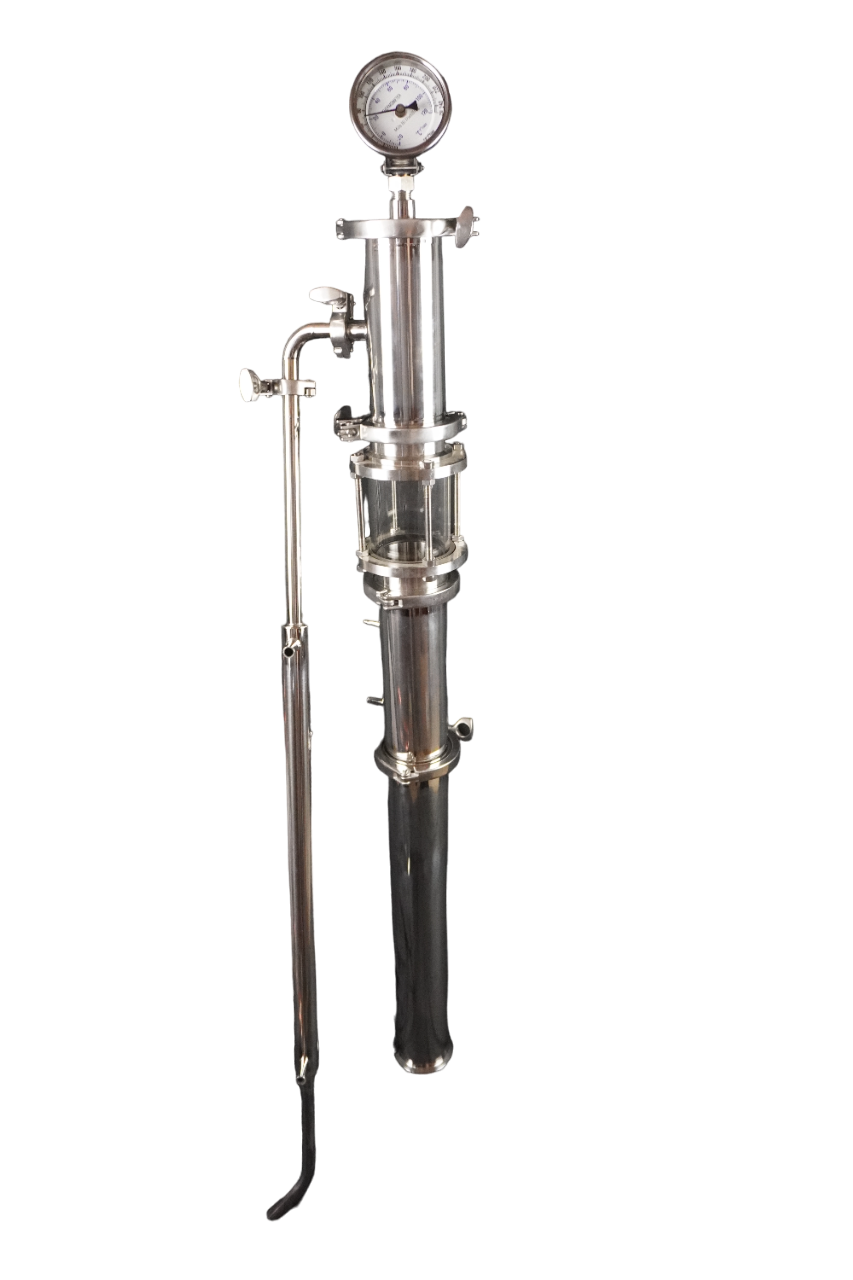 A high quality 3 Inch Diameter Torpedo Pro tower that includes a 3" sight glass. You can use this sight glass with the included screened gasket as an infusion chamber or gin basket to hold botanicals. You can also clamp in sight glass below the reflux cold finger condenser to watch the reflux happen in action. An awesome way to infuse the vapor to get a boost of flavor in the distillate. Run an apple brandy and add some fresh apples and cinnamon sticks to the sight glass to infuse the vapor with the taste of apple pie moonshine or add cinnamon sticks, herbs, and spices to make a spiced whiskey. Be creative and make your own infusions.