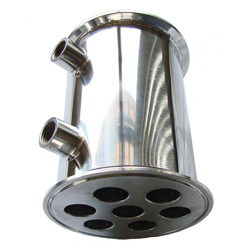 Flute 4 Inch Mile Hi Flute Dephlegmator for a distilling tower 4" diameter x 6" tall with tri-clamps ferrules. Does not include clamp and gasket.