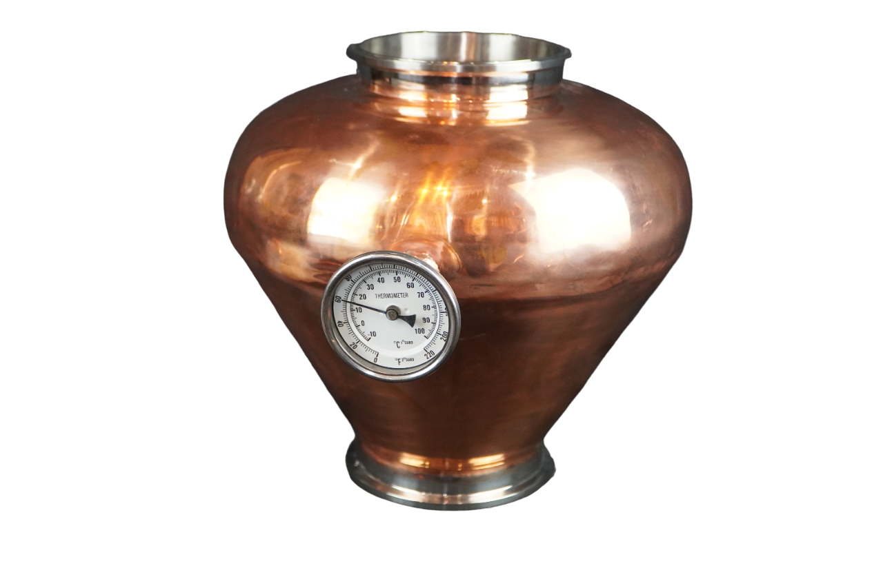 Copper whiskey helmet with 6" tri-clamp on top and bottom. These copper whisky helmet can be used with 6" tri-clamp connection and are ideal to put in the Mile Hi Flute column. Traditional whiskey helmets help with blending of spirit vapor to give final spirits a unique flavor profile. These copper helmet can also be used when making other spirits like brandy where flavors carry over and uniqueness is essential. These are a nice additional add on to the flute stills.