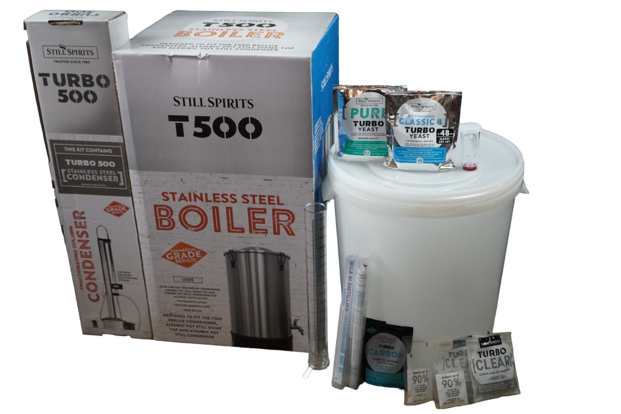 Still Spirits Turbo 500 Distillation Kit is a revolutionary product from New Zealand; a technology breakthrough. Includes faucet adapter for ease of water flow adjustment. 25-liter boiler (6.6 Gallons) with tap and an integrated closed heating element and a boil dry reset. Thermal cut out fuse, waste discharge tap, and electronic thermostat (water flow and reflux temperature)  The ultimate home distillation unit. Stops producing when the alcohol is exhausted. Effectively self-contained. The "Turbo 500" or "T500" are all serial numbered for quality control.